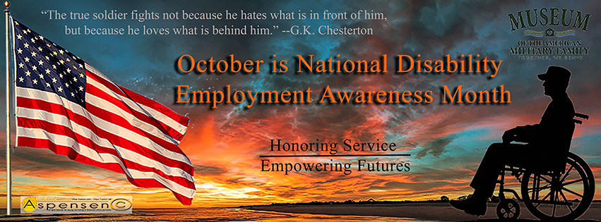 The MAMF October 2025 Facebook Banner Ceilon Aspensen, October 1, 2025December 29, 2025 October is National Disability Employment Awareness Month. This month’s Museum of the American Military Family (MAMF) banner is designed to draw attention to those in our midst, at work or elsewhere, who have disabilities. While the banner features someone in a wheelchair, it is important to remember that many people have invisible disabilities. We may not be able to see them, but they are still challenged by them. I find that often-misattributed quote very helpful when thinking about this issue: “Everyone you meet is fighting a battle you know nothing about. Be kind. Always.” While it’s important to remember the struggles that people with disabilities face, I think it is even more important to remember that they also make major contributions to our society. Despite their disabilities, they have jobs, raise children, and contribute in so many ways. Disabilities do not define them. Their contributions do. I have a few minor disabilities that make mobility more difficult for me than the average person, but nothing big enough yet for me to feel a need to claim disability. However, about eight years ago I broke my right leg so badly that I was nonambulatory and wheelchair bound for two months. I had an external fixator in my right leg. I couldn’t put any weight on my right leg for two months. I had two surgeries to correct the break (one to install the fixator and one to remove it). That was followed by six months of physical therapy. I walked with a limp for eight months. Because I was in a wheelchair for two months, and on crutches for four more months, I became suddenly hyperaware of how, despite the Americans with Disabilities Act (ADA), most places are not equipped very well to accommodate people with ambulatory disabilities. That was an educational period of synchronicity for me, where I was hyperfocused on the issue simply because I was so dependent on those accommodations. People would park their cars blocking the easy access ramps at street corners, blocking my ability to cross the street in my wheelchair. All of the pushbutton door-opening mechanisms for wheelchair-bound people at Glacier National Park that summer were turned OFF. If my husband had not been with me I would have been trapped either inside or outside the lodge. I was also surprised at how unhelpful people were when they saw me struggling. We can do better, people! All it takes is a little awareness, kindness, and compassion. Look around wherever you are. See if there is someone who needs your assistance. Help them. And if they don’t need your assistance because they have an invisible disability, simply BE KIND. So much good and productivity can be facilitated just by being kind to the people around you. So, during this October, please try to be more aware of those around you with disabilities, both visible and invisible, and in the words of John Wesley: “Do all the good you can, by all the means you can, in all the ways you can, in all the places you can, at all the times you can, to all the people you can, as long as ever you can.”